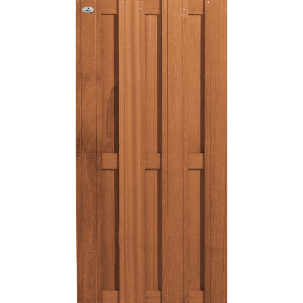 Bangkirai hardhouten Tuinscherm met planken. Geschroefd met RVS schroeven, gegarandeerd een lange levensduur.