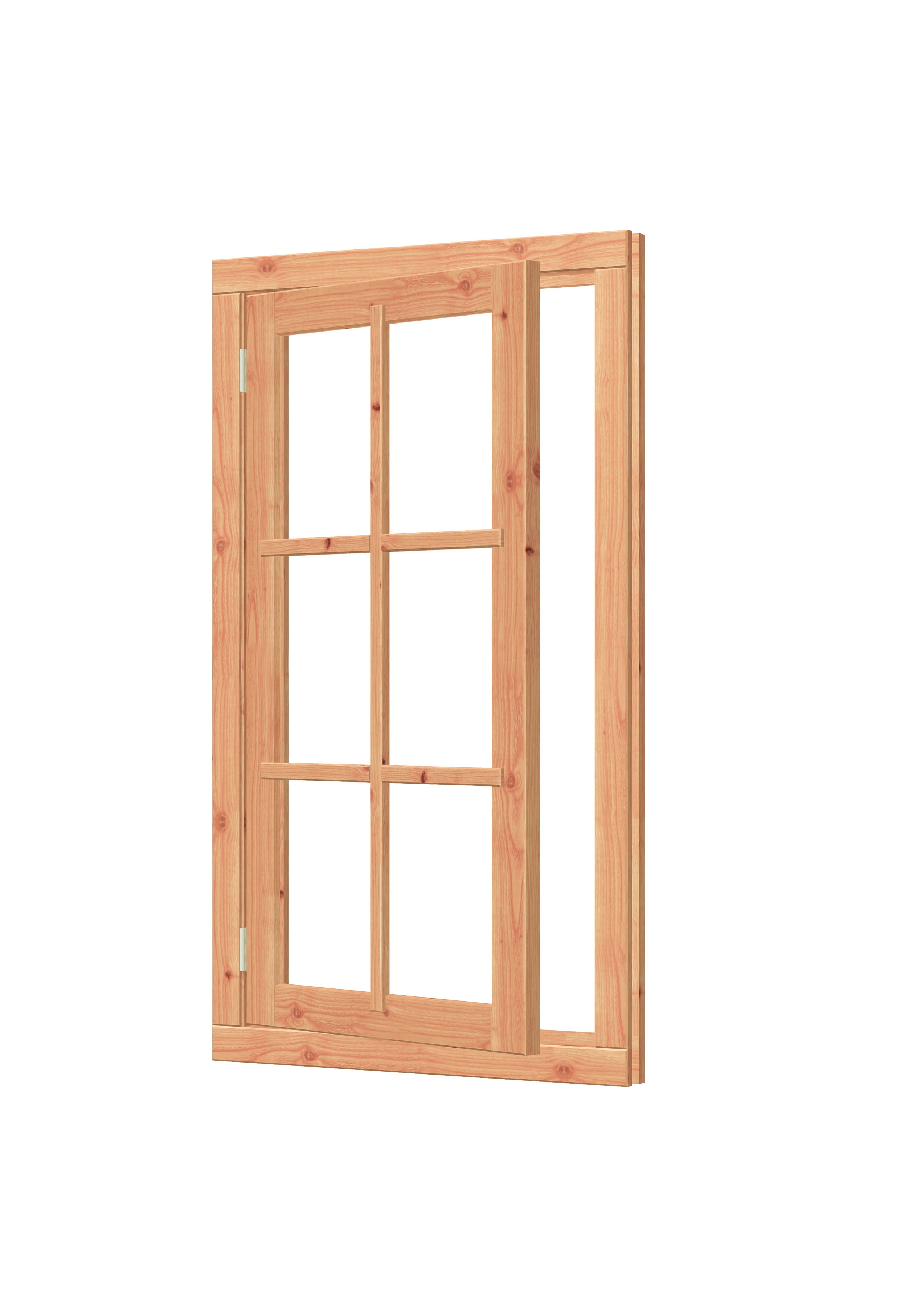 – Raam + Kozijn: 808 x 1430 mm. - Materiaal: Hoogwaardig Douglas-hout, dat van nature bestand is tegen vocht, schimmel en houtrot, ideaal voor buitengebruik.
