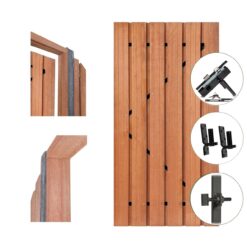 De volledigheid van deze hardhouten tuinpoort komt tot uiting met het meegeleverde kozijn en aanslagligger, wat niet alleen de installatie vergemakkelijkt maar ook structurele stabiliteit toevoegt aan de poort.