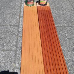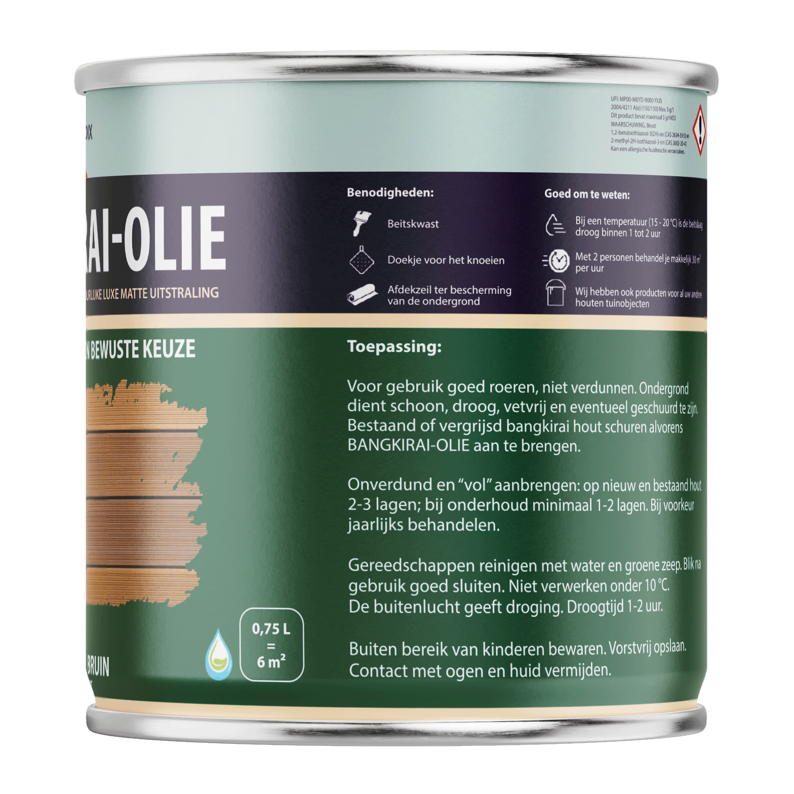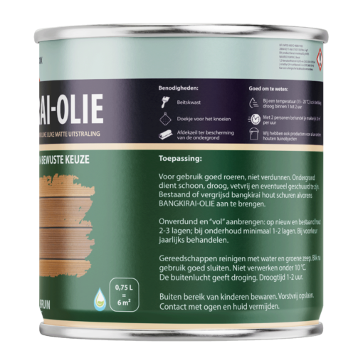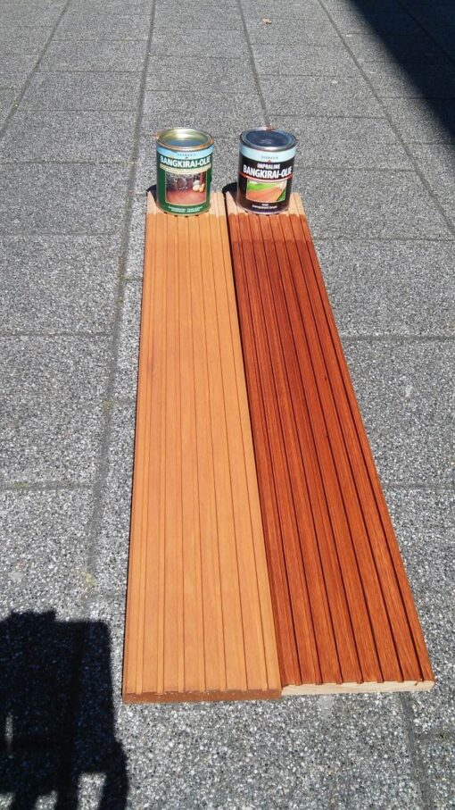 De bijzondere samenstelling op basis van speciale oliën zorgt voor een goede indringing en verankering. bladderen is uitgesloten. het natuurlijk karakter en de kleur van het hout blijft behouden. watergedragen, dus minder milieubelastend. na droging geeft Bangkirai-olie een langdurige, waterafstotende bescherming en voorkomt vergrijzing. de behandeling, met name de liggende delen, regelmatig herhalen.