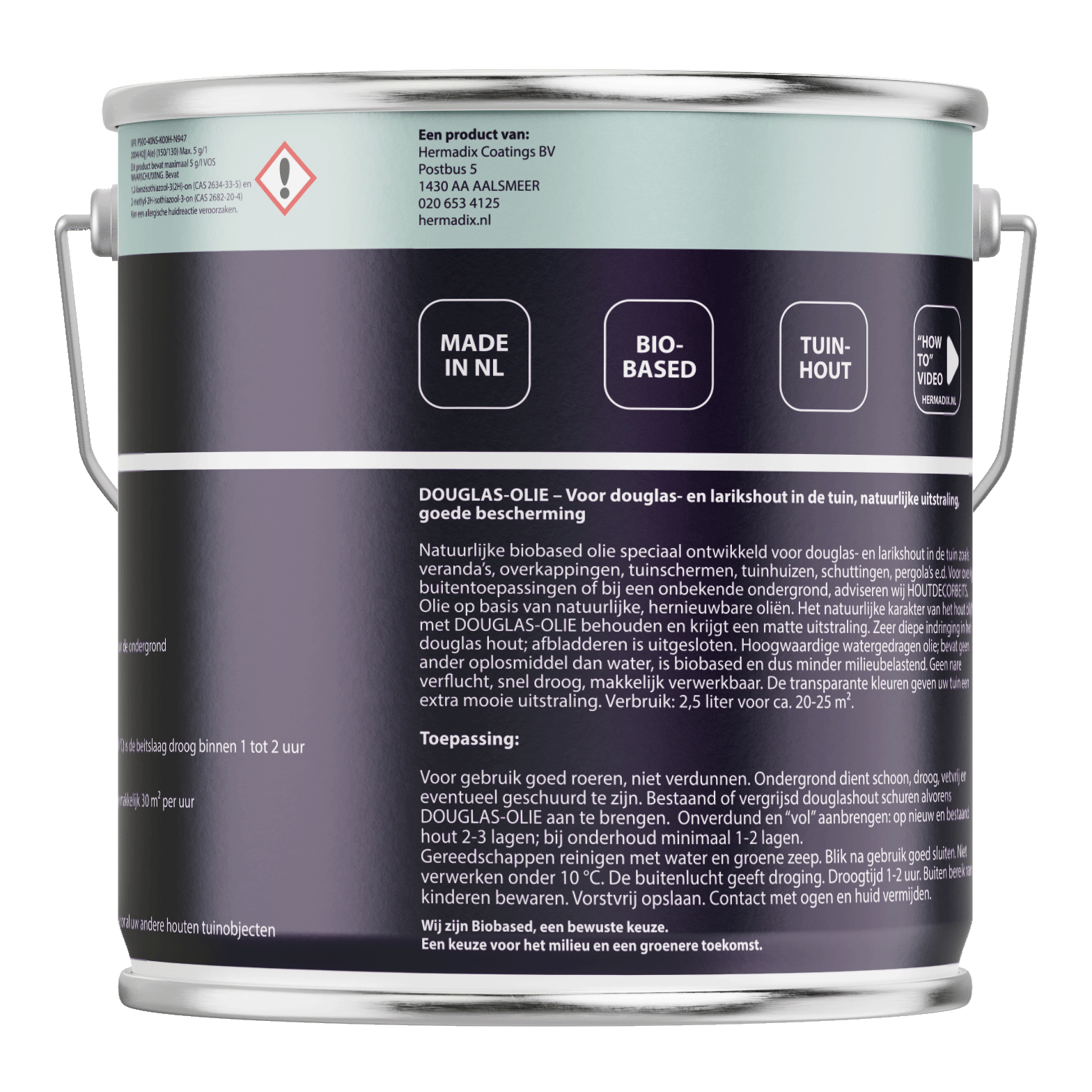 Hermadix Douglas-olie is een watergedragen, mens- en milieuvriendelijk olie op basis van natuurlijke ingrediënten, speciaal ontwikkeld voor nieuw en oud Douglas en Lariks hout. Douglas-olie geeft een mooie transparante uitstraling zodat de houtnerf- en structuur zichtbaar blijven. Douglas-olie dringt diep in het hout en geeft een matte natuurlijke uitstraling. Douglas-olie droogt snel en is makkelijk verwerkbaar.