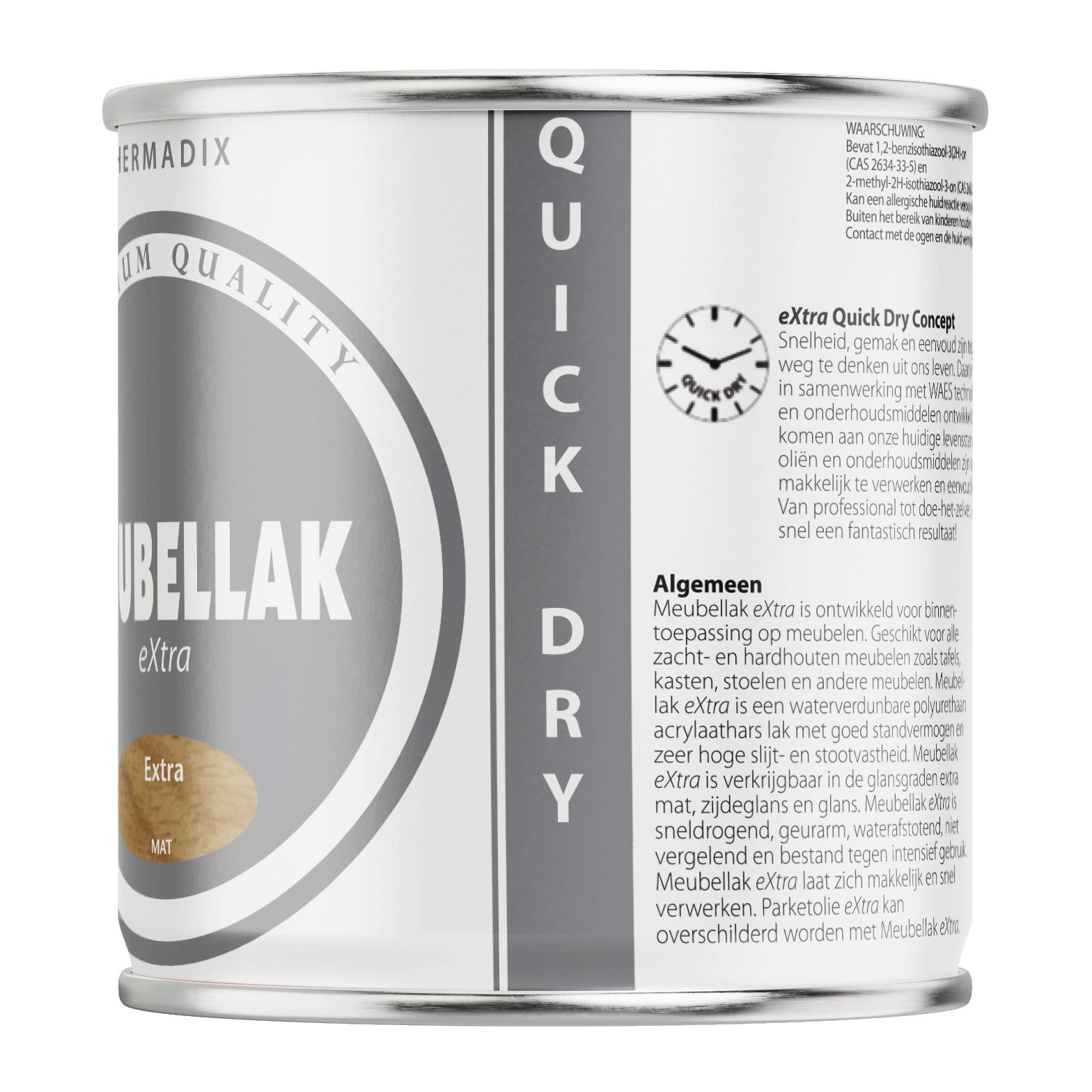 Meubellak eXtra is ontwikkeld voor binnentoepassing op meubelen. Geschikt voor alle zacht- en hardhouten meubelen zoals tafels, kasten, stoelen en andere meubelen. Meubellak eXtra is een waterverdunbare polyurethaan acrylaathars lak met goed standvermogen en zeer hoge slijt- en stootvastheid. Meubellak eXtra is verkrijgbaar in de glansgraden extra mat en zijdeglans. Meubellak eXtra is sneldrogend, geurarm, waterafstotend, niet vergelend en bestand tegen intensief gebruik. Meubellak eXtra laat zich makkelijk en snel verwerken. Parketolie eXtra kan overschilderd worden met Meubellak eXtra.