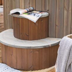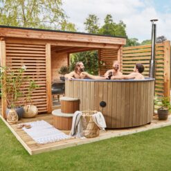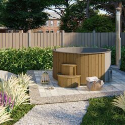 inclusief: Bevestigingsmaterialen, Thermocover, antraciete polyester binnenbak, rvs-houtkachel, pijp, trap, led-verlichting, bubbelsysteem, Stereo en Usb-aansluiting.