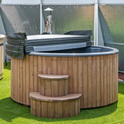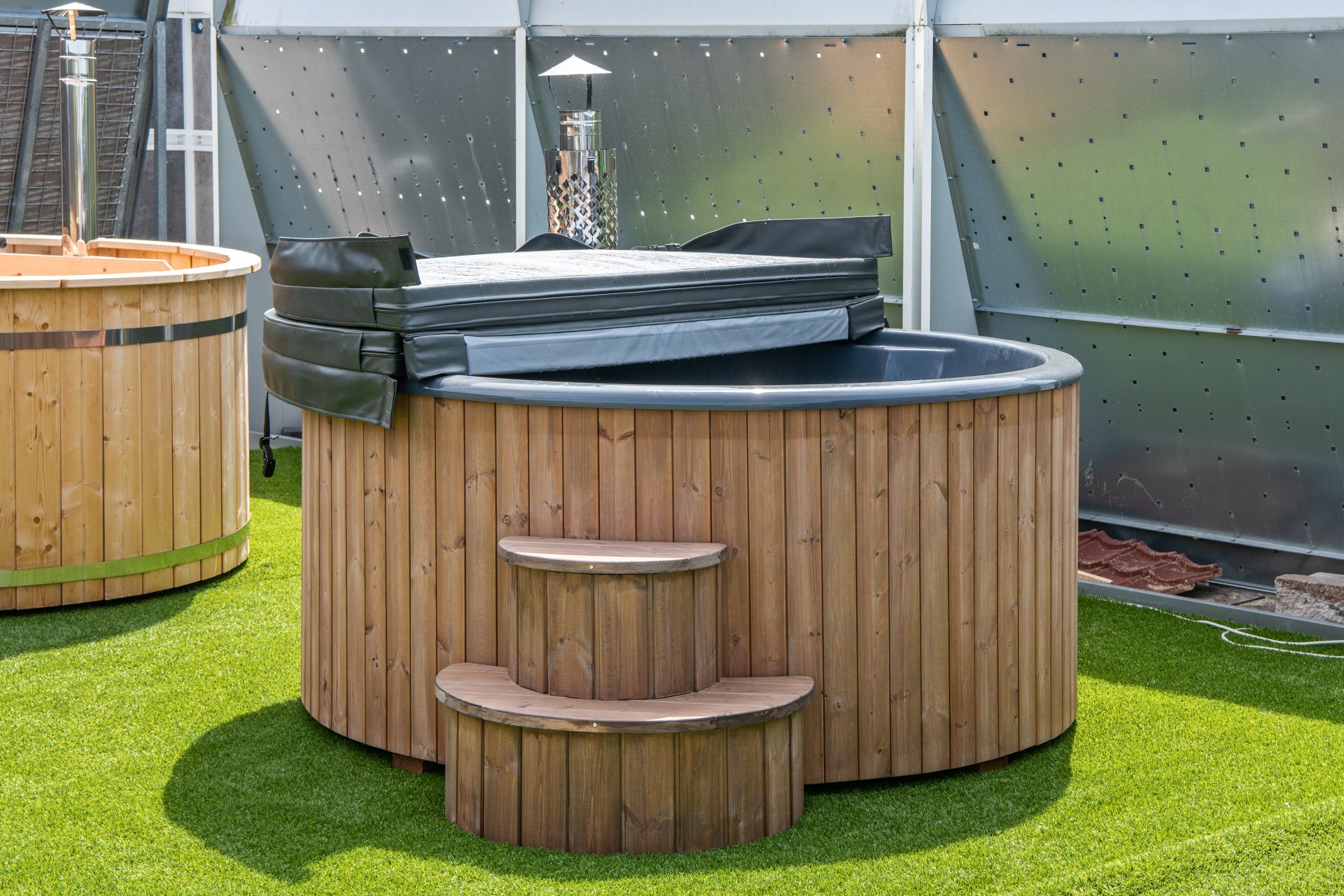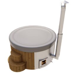 inclusief: Bevestigingsmaterialen, Thermocover, antraciete polyester binnenbak, rvs-houtkachel, pijp, trap, led-verlichting en bubbelsysteem.