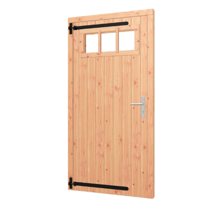 De Opgeklampte Deur Enkel met bovenraam is geschikt voor gebruik in schuttingen, tuinhuisjes, bergingen of andere buitenconstructies waar een stevige en stijlvolle deur met lichtinval gewenst is.