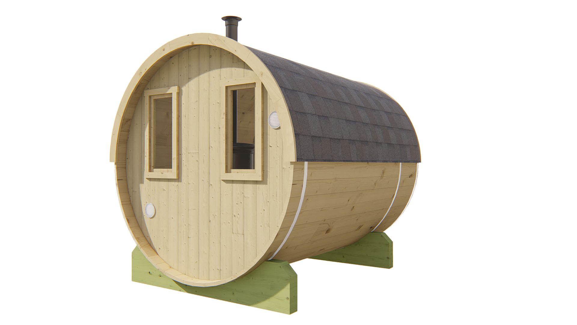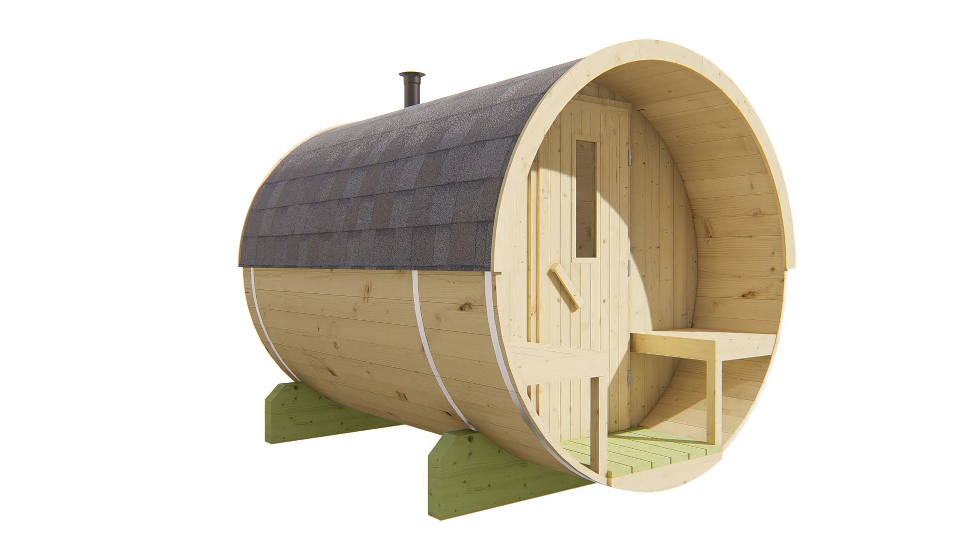 Inclusief: zwarte dakshingles, vuurvaste plaat voor kachel, espen saunabanken en vuren bankjes buiten